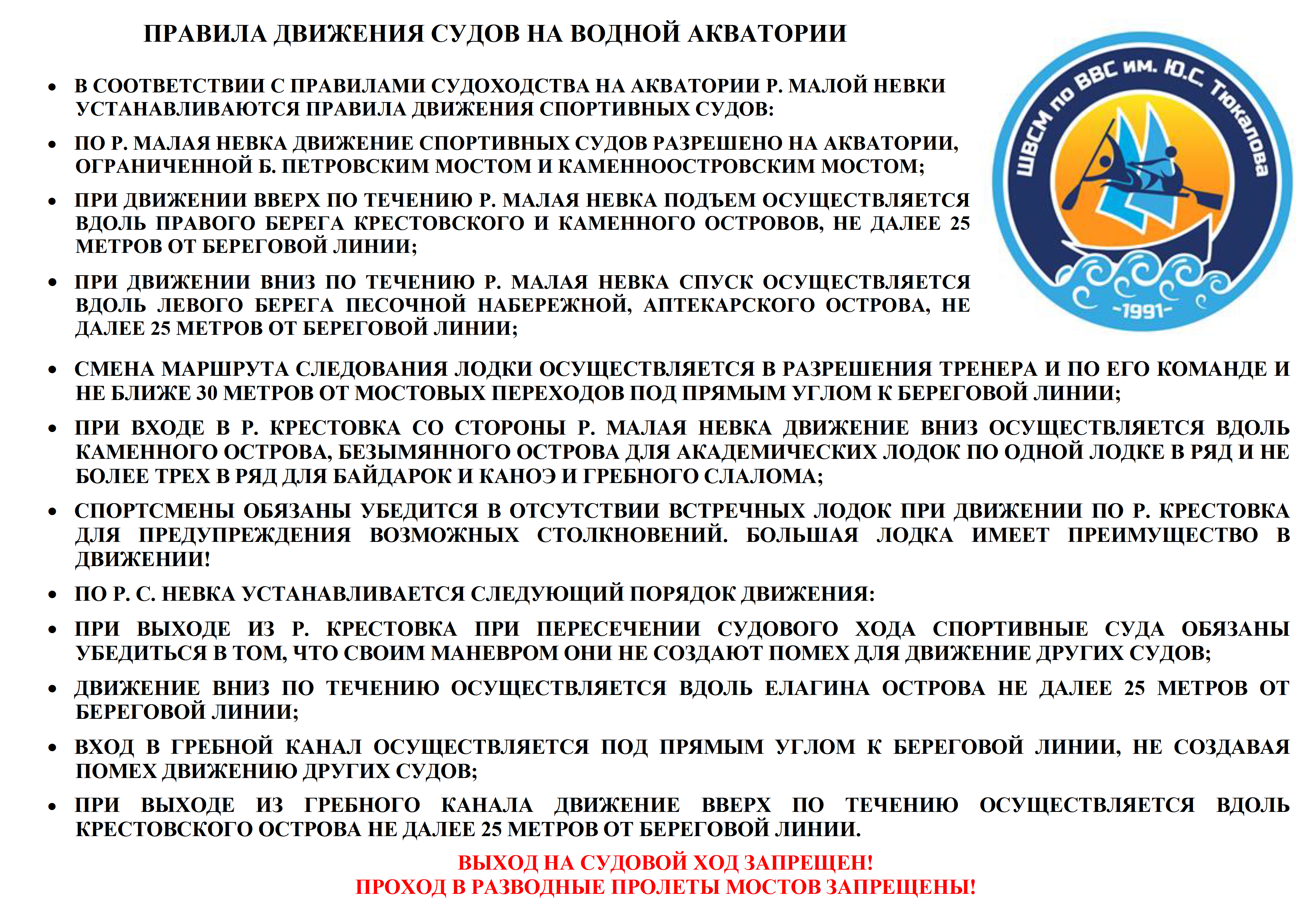 Выход на водную акваторию разрешается с 9:00 до 18:00 в пределах видимости с берега (1000 метров) и на территории гребного клуба «Знамя».